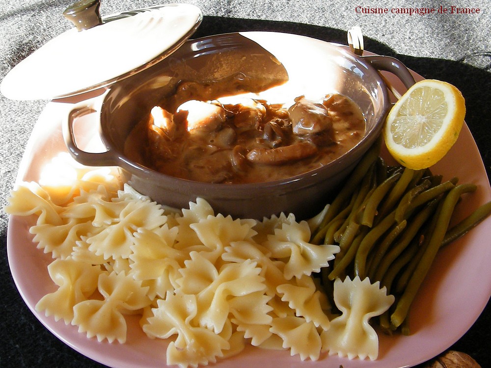 Faire sauter le tout puis mouiller avec un verre d'eau ou de bouillon. Laisser mijoter avec un couvercle 45 à 60 minutes (10 minutes environ avant la fin de cuisson, découvrir afin que le jus s'évapore un peu.)